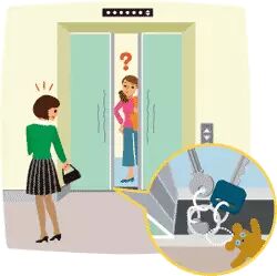 宠物的绳子、围巾、跳绳等长绳状的东西必须注意,夹在电梯门上开始运行有可能导致重大事故。上下电梯时,绳子要短一点,尽量携带宠物,如果电梯门夹住绳子,请从绳子脱手!
