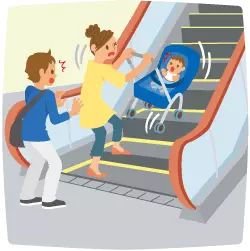 婴儿车上扶梯是非常危险的,车轮搞不好就会导致婴儿车失去平衡,这是非常危险的,千万不要这样做!