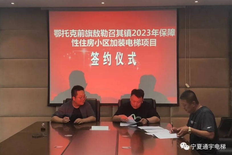 近日,宁夏通宇电梯制造发展股份有限公司法人和内蒙古明煜建筑工程有限公司法人、鄂托克前旗鑫盛建设工程有限责任公司法人进行加装电梯签约,正式达成合作意向,共计50台通宇电梯将被加装到鄂托克前旗敖勒召其镇的保障性住房项目中。大家对合作的前景充满信心,各方将积极配合,确保项目顺利推进,让当地居民享受到更便捷、安全的垂直交通方式,提高生活质量。